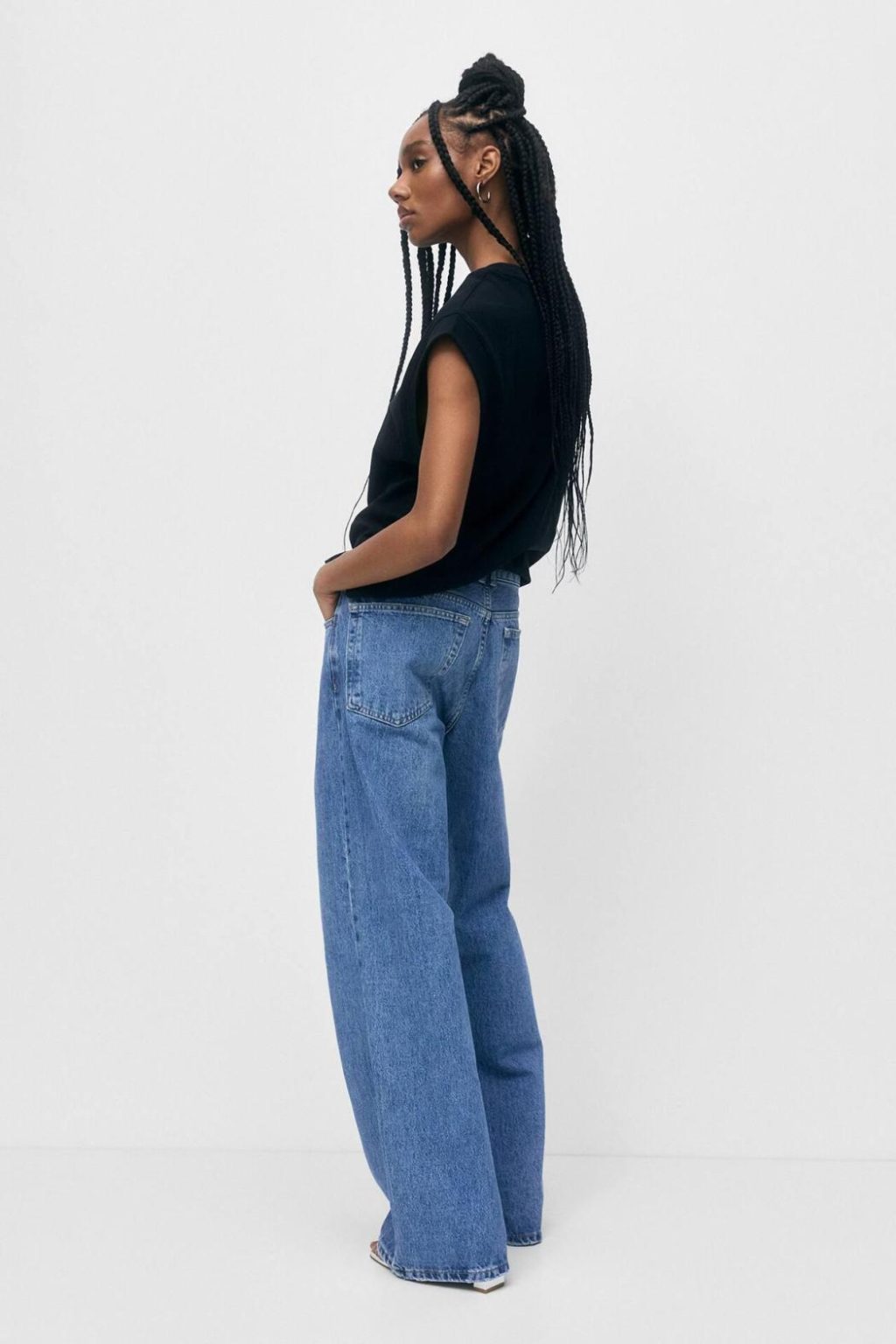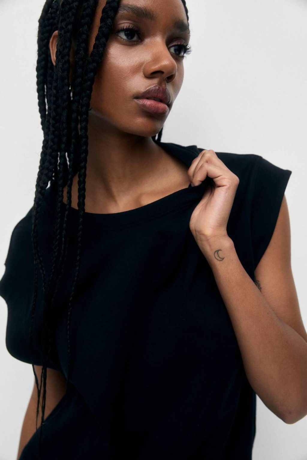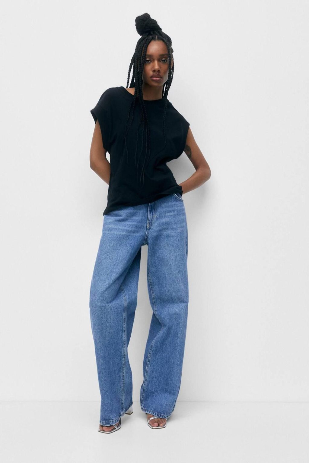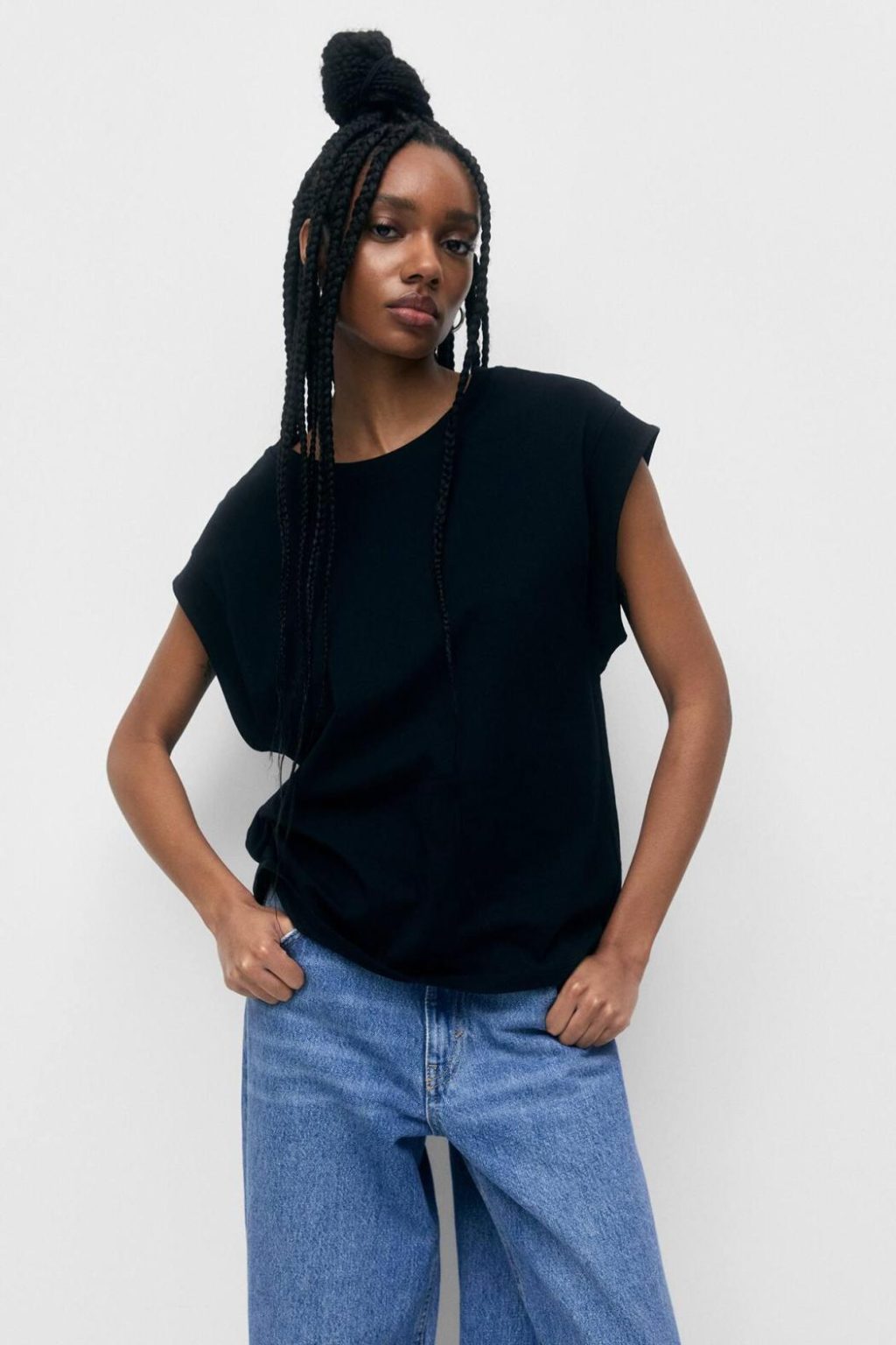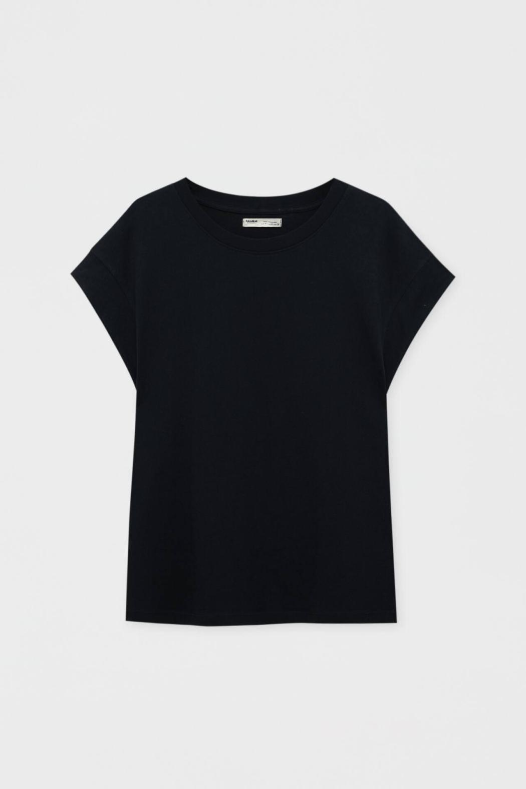 Basic Crew Neck T-Shirt Featuring Wide Cap Sleeves With Trims. Composición