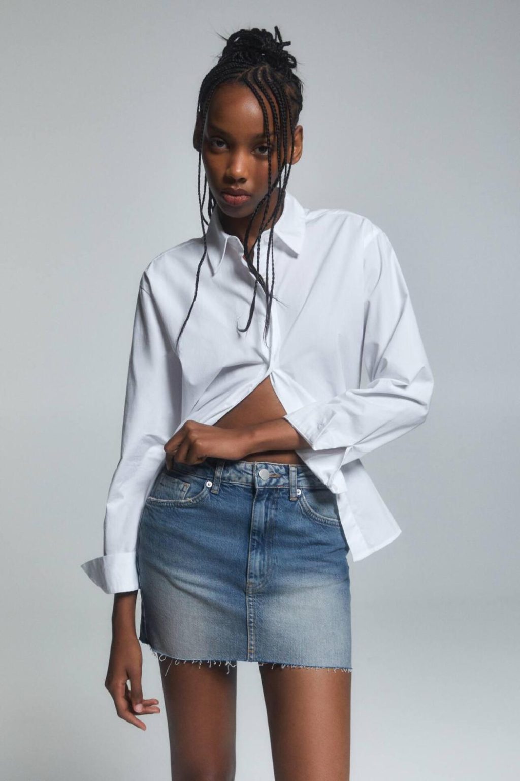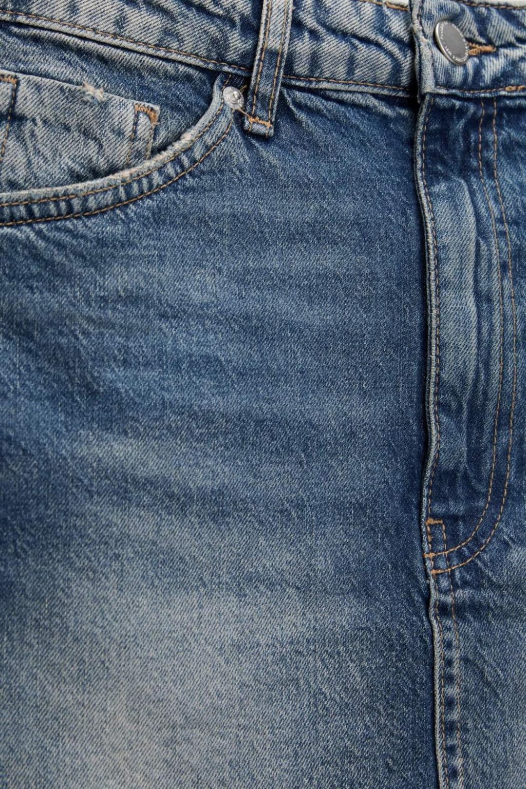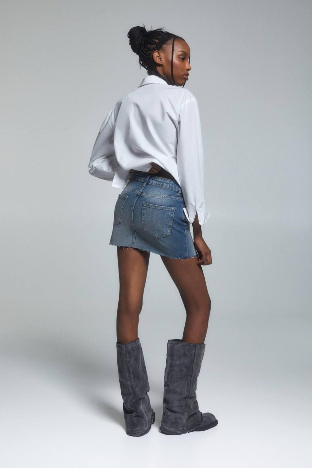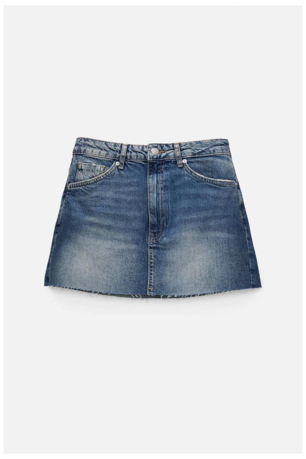 Denim Mini Skirt With A Frayed Hem, Pockets, Belt Loops, And Zipper Fly And Top Button Fastening. Composición
