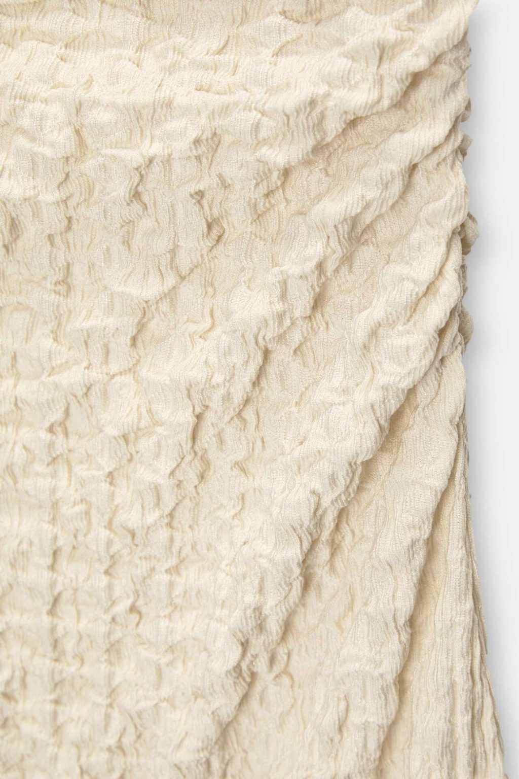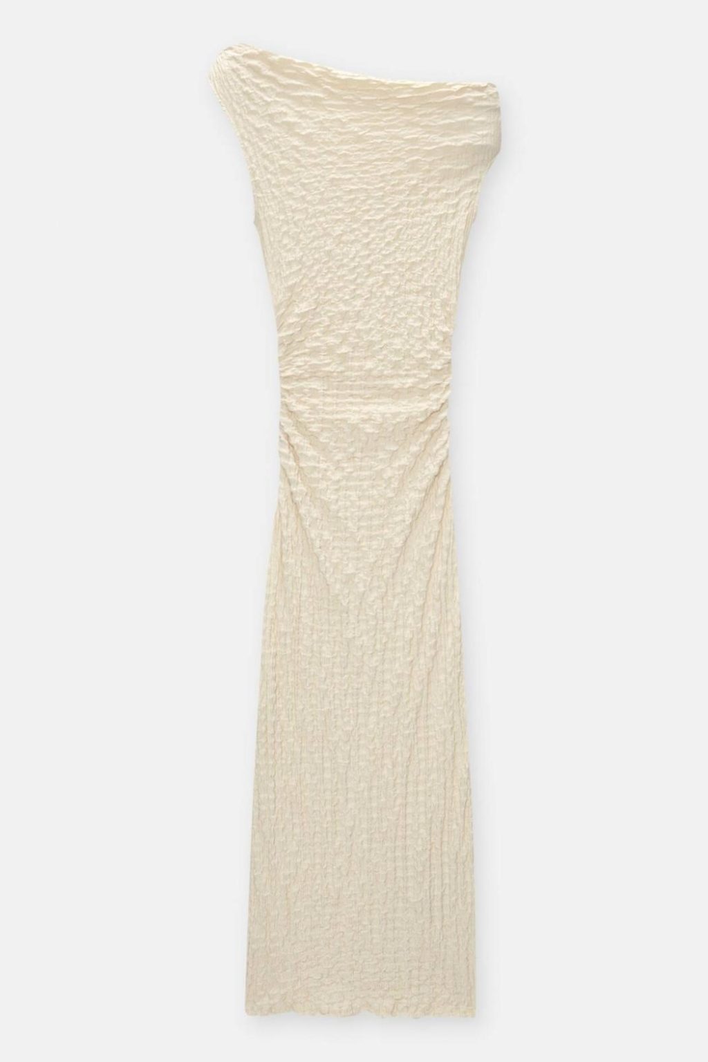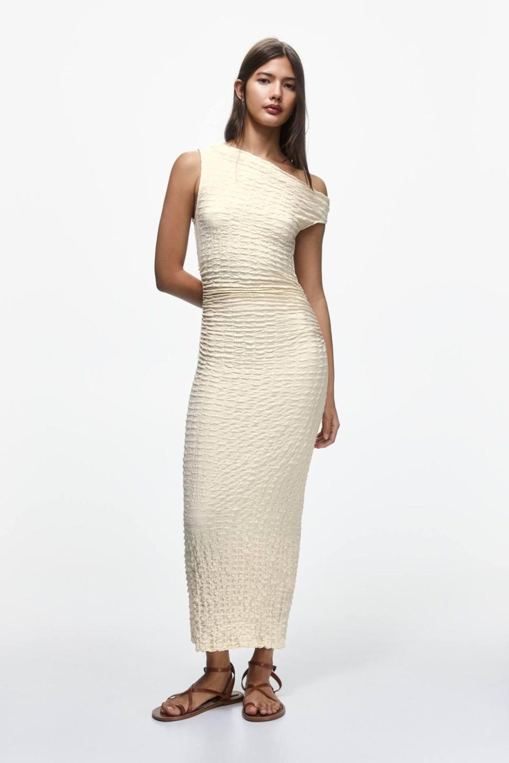 Asymmetric Midi Dress With A Cowl Neckline And Gathered Detail. Made Of Textured Fabric. Composición